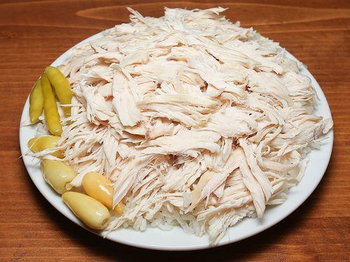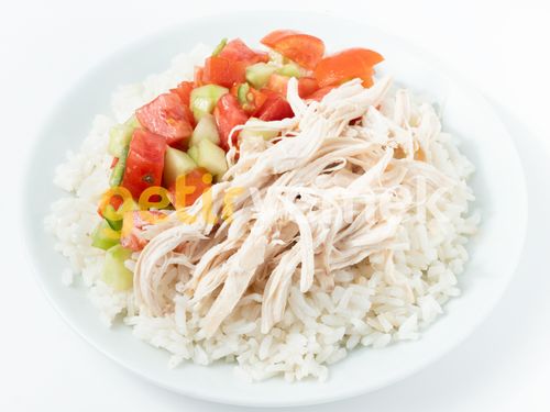 Pilav üzerine az porsiyon haşlanmış tavuk eklenmiş sade tabak.
