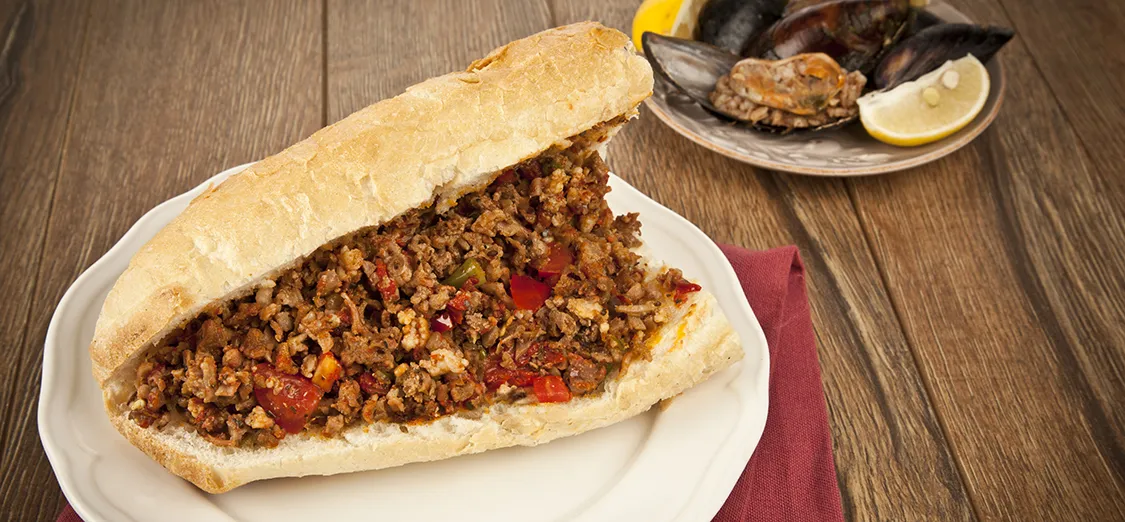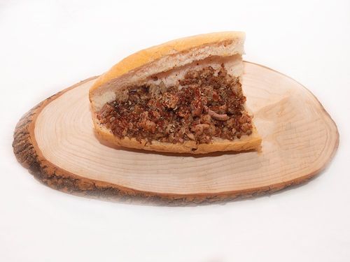 Domates, biber, kimyon, kekik ve tuzla hazırlanan klasik kokoreç, çeyrek ekmekte.