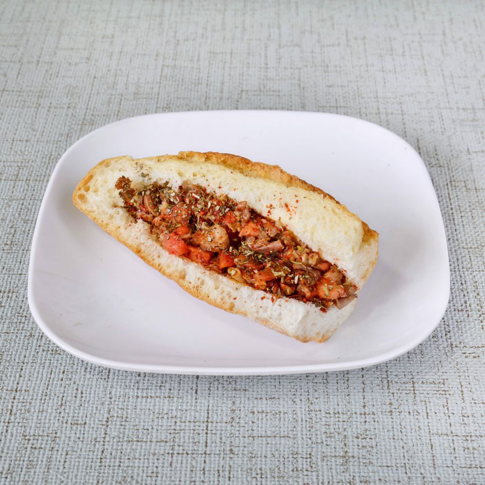 Domates, biber, kimyon, kekik ve tuzla hazırlanan klasik kokoreç, yarım ekmekle.